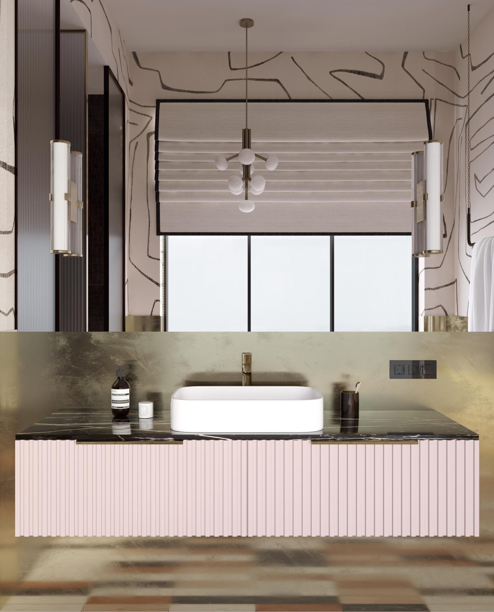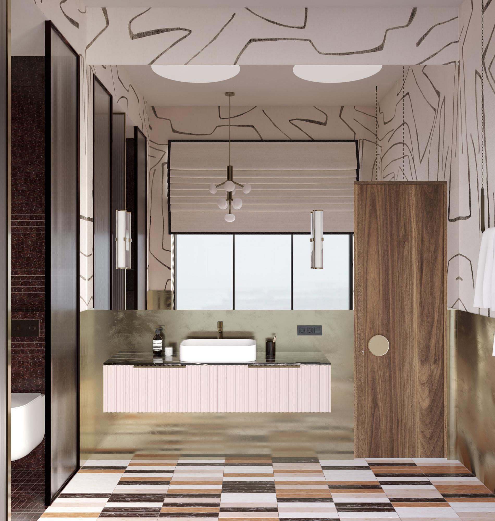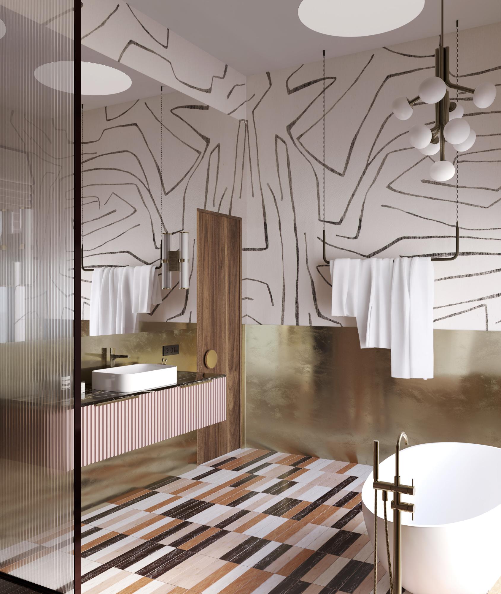 Автор проекта - Малахова Ксения Эпоха «ревущих двадцатых» - роскошные клубы, небоскребы, путешествия на лайнерах и локомотивах, все это осталось позади, но жителю 21 века очень легко вписать себя в этот ритм, потому что уровень жизни и комфорта практически совпадал с настоящим. Так, проектируемый объект расположен в одном из московских небоскребов, а заказчица - вокалистка джазового ансамбля. Ванную «обволакивают» грубые латунные панели и орнаментальные обои ручной работы, отдаленно напоминающее что-то анималистичное и местами заимствованное из древних цивилизаций. Футуристичные источники освещения, имитирующие музыкальные инструменты, ритмичная плитка из натурального камня, парящие полотенца, а также рифленые поверхности тумбы и душевых перегородок, как джазовые аккорды духовых и клавишных инструментов - переливаясь и отражаясь в зеркальных и металлических плоскостях, они выступают главными героями этого интерьерного ансамбля. В проекте использована продукция компании MEER: тумба LUNA в пудрово-розовом оттенке, роскошная ванна ASTY JULIA белого цвета, а также раковина ORNELLA.