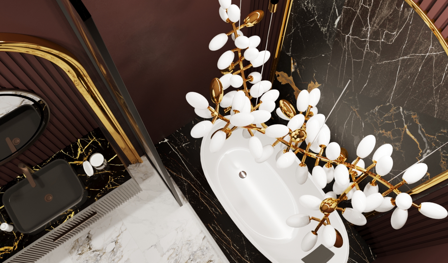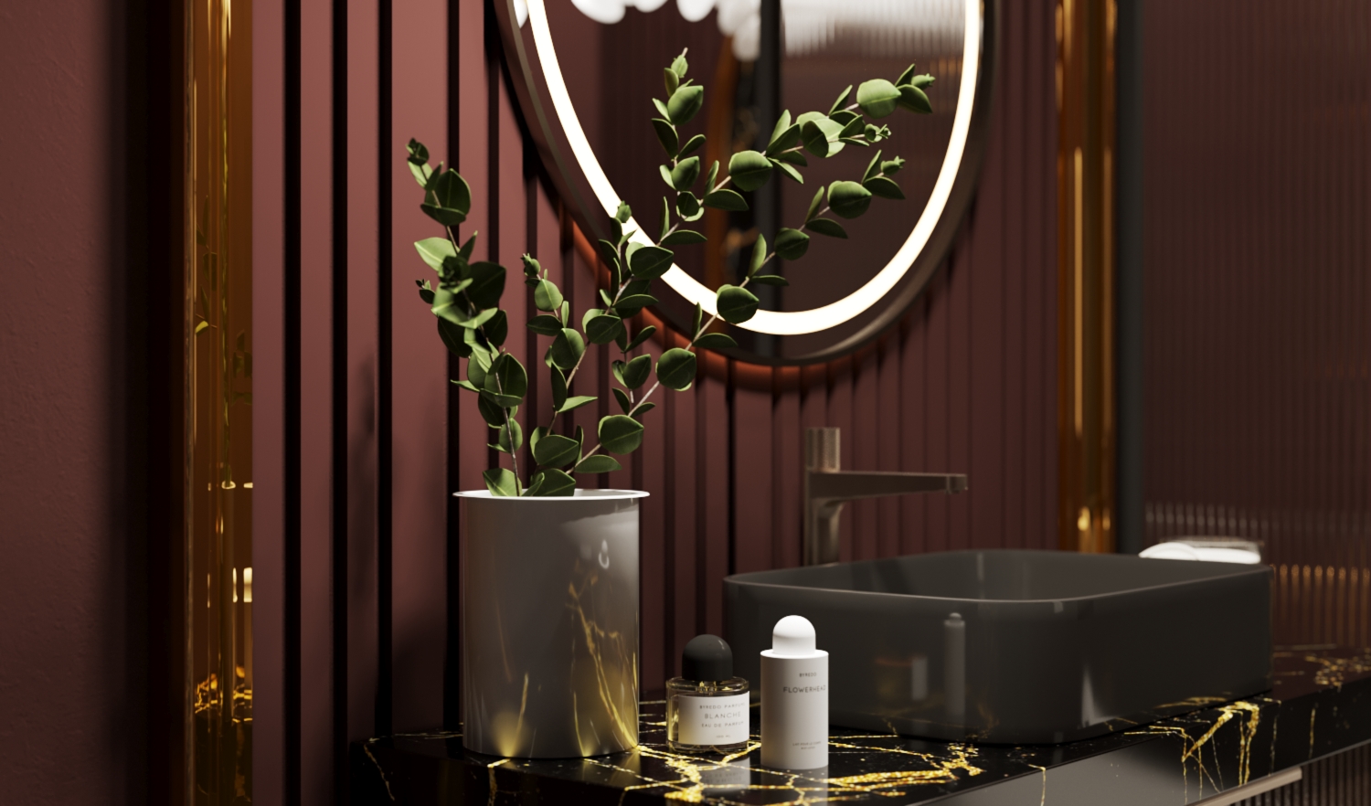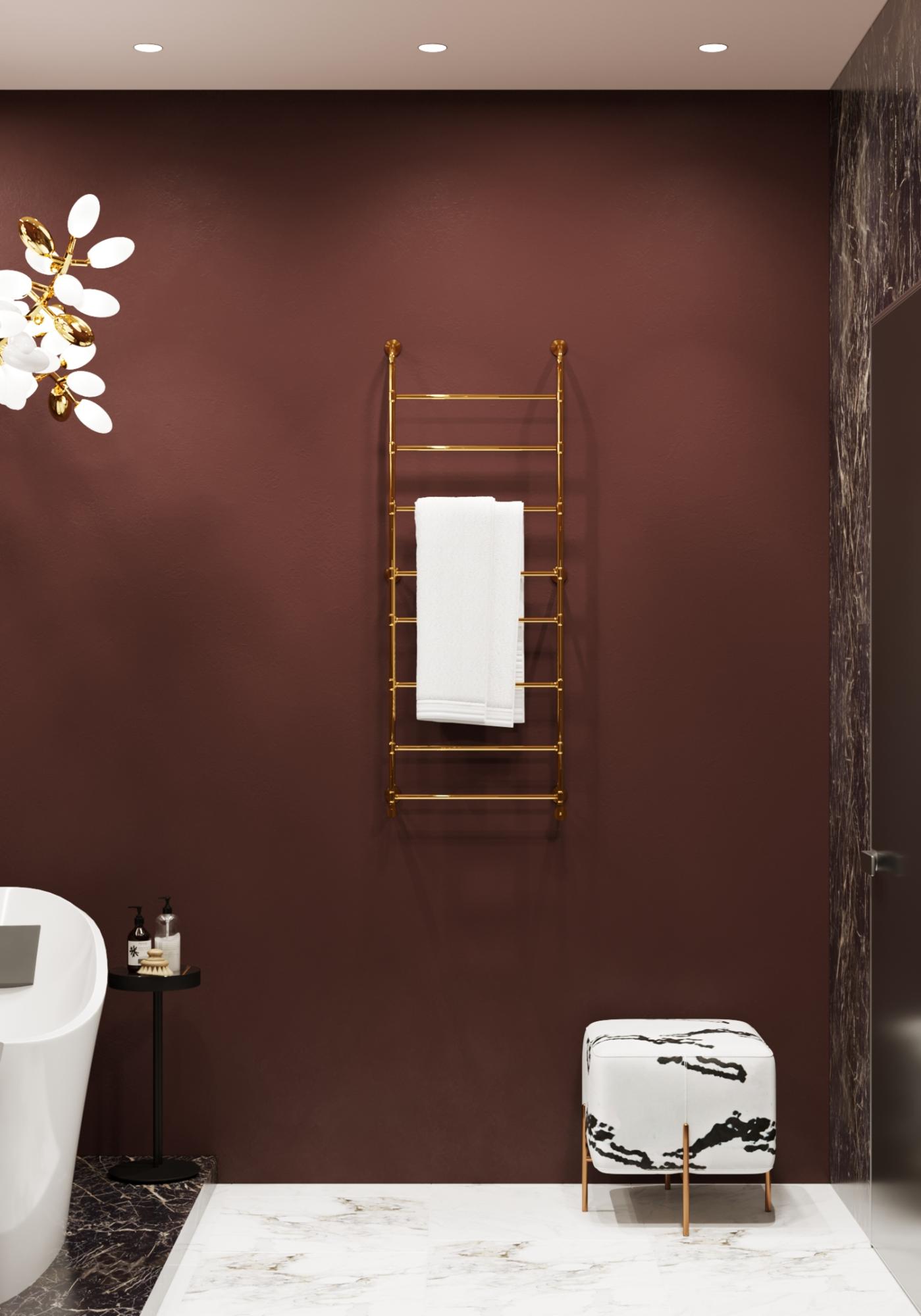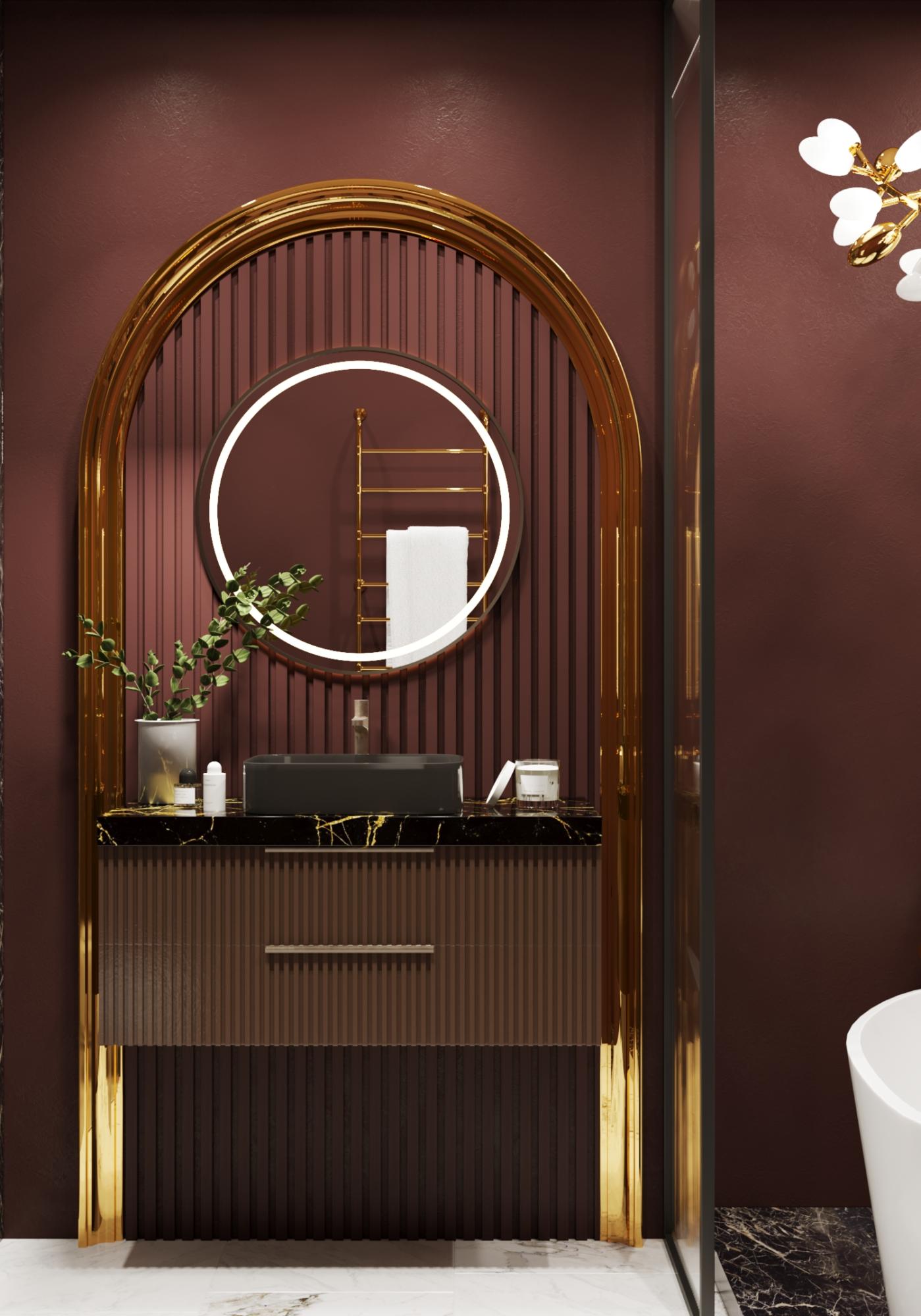 Автор проекта - Жукова Виктория Ванная комната располагается в загородном доме и принадлежит хозяйке семейства. В основу проектирования легли пожелания заказчицы иметь отдельно стоящую ванную, где можно расслабиться и посвятить время себе любимой. Так же необходимо было предусмотреть большую раковину с хорошей системой хранения под все косметические средства. За идею я взяла одно из хобби заказчицы – она увлекается коллекционированием элитного красного вина. Санузел выполнен в глубоких винных тонах с черными броскими акцентами, как хорошее коллекционное вино. Рифлёное стекло, выполненное на заказ по индивидуальным размерам, и настенные рейки от производителя делают отсылку к рифлёному стеклу, которое часто используют для разлива вина. Арки выделяют зону ванны и зону умывальника. Идея арок пошла еще из самых истоков винодельческого искусства, когда делали металлические арки в саду, по которым взбирались гроздья виноградников. Роскошные обои из Нео камня не только добавляют красивого акцента в зоне ванны, но еще и являются необычной альтернативой натуральному камню. Красивая люстра в виде гроздьев винограда и роскошная тумба с раковиной от производителя MEER лаконично преобразуются в единое пространство для максимального расслабления и комфорта заказчика.
