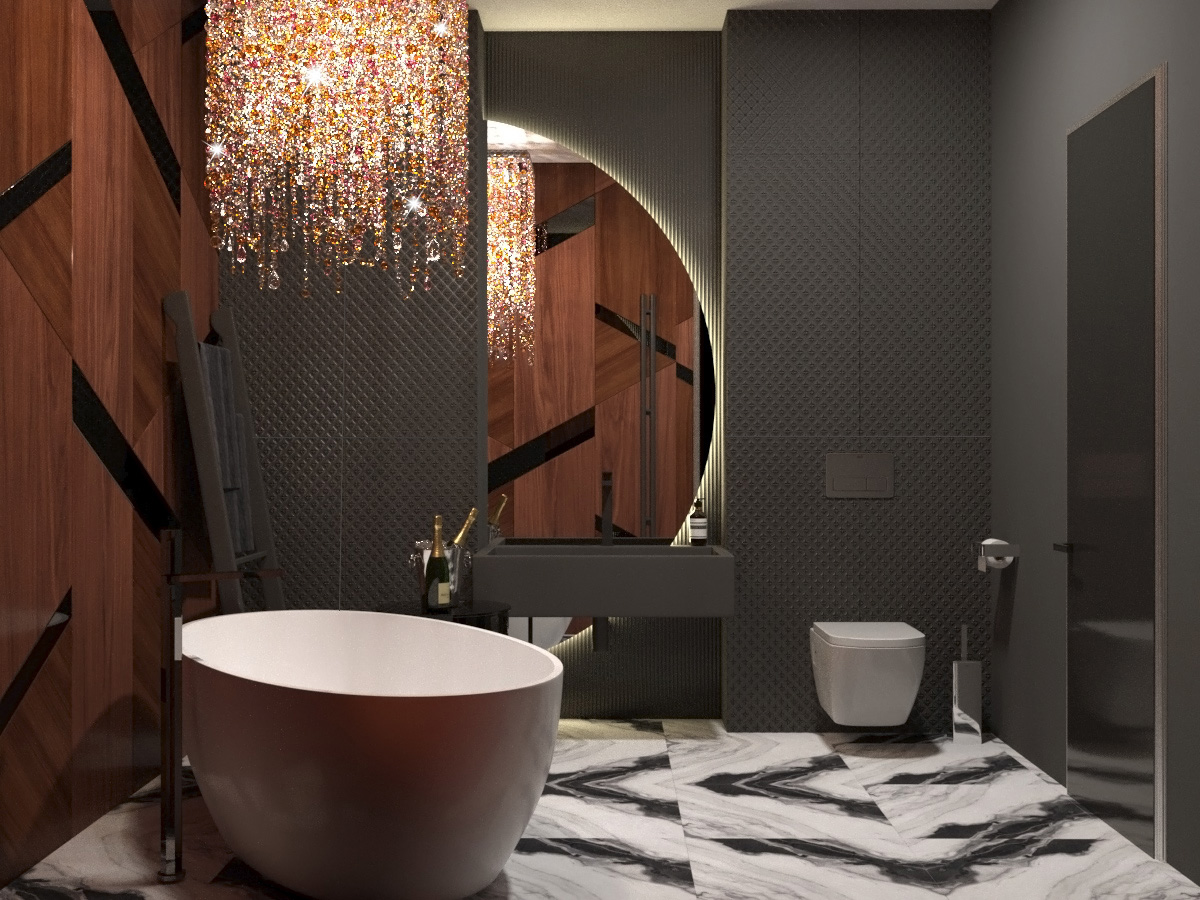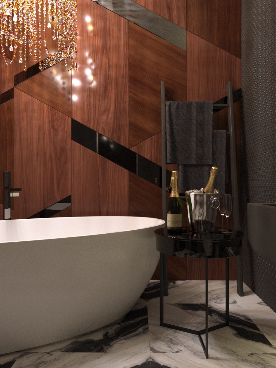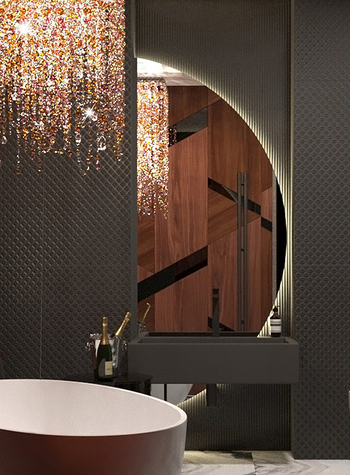 Автор проекта - Штукатурова Александра Проект выполнен для семейной пары и расположен в Сочи. Эта ванная комната не является основной в доме и ее пространство предназначено для отдыха и релаксации хозяйки. Главным героем тут выступает отдельностоящая ванна ASTY JULIA. Благодаря интересным фактурам, разным масштабам геометрии и эффектному освещению в небольшом помещении удалось создать атмосферу роскоши