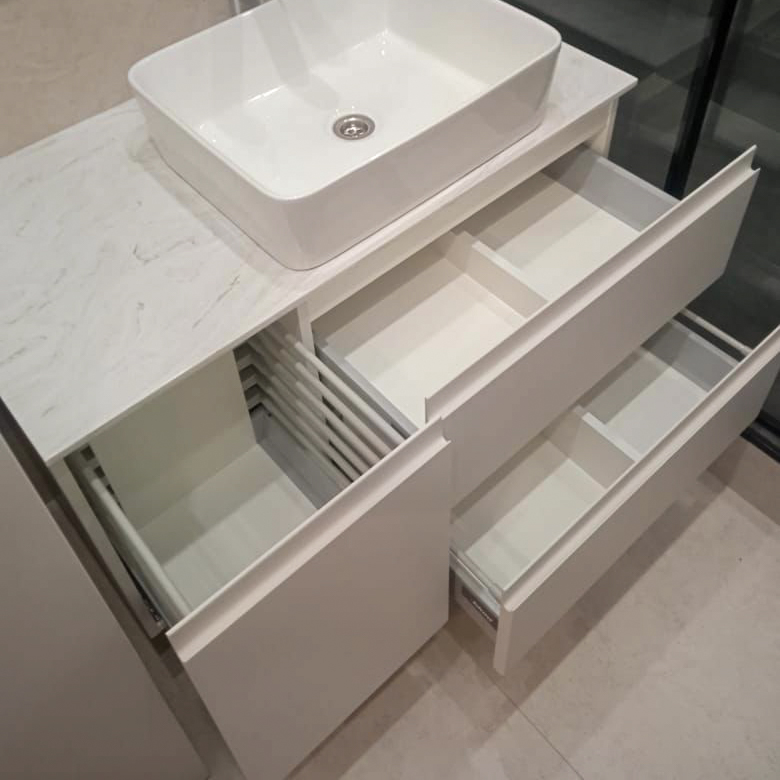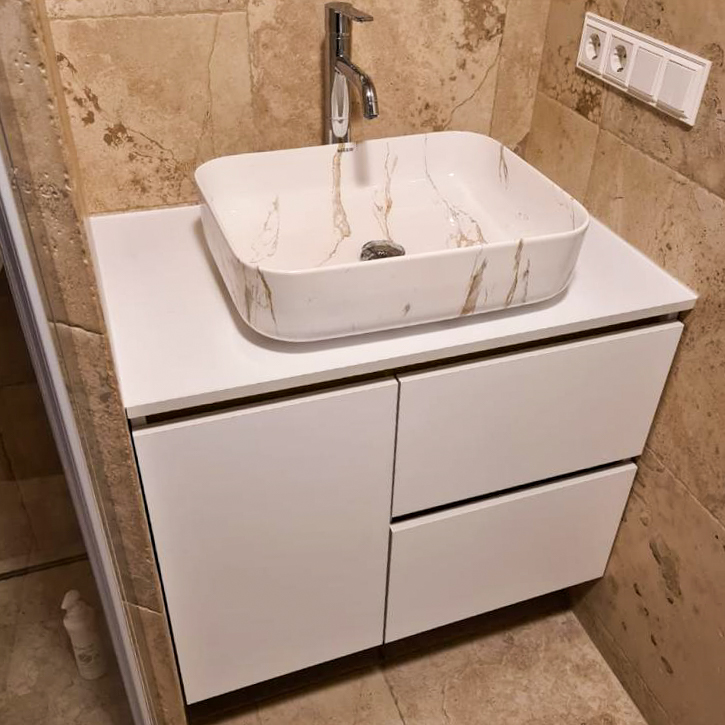 LAURO - минималистичная навесная тумба. Вы можете выбрать наполнение тумбы, ручки (накладные, скрытые, без ручек - система открывания Tip-On), цвет столешницы, цвет боковых элементов и фасада из палитры ADILET, RAL, NCS Количество ящиков - от 1 шт Материал столешницы - искусственный камень Материал боковых элементов, фасада - влагозащищенный МДФ, ЛДСП Материал ящиков, дна тумбы - ЛДСП Покрытие фасада - пленка, эмаль Фурнитура - Boyard, Blum Тип крепления - навесное Цена указана за тумбу в размере (ШхГхВ) - 900x480х480 мм, 2 выдвижных ящика + распашная дверь, столешница 900х480х12 мм, цвет белый, фурнитура Boyard Мы изготовим необходимую Вам мебель по индивидуальному размеру и макету, с любым функционалом. Более 5000 цветовых решений по RAL или NCS палитре. Широкий выбор материалов - МДФ в эмали, МДФ в плёнке, AGT, FENIX, SMART, CLEAF. Выбор фурнитуры от средних до премиальных брендов. Для получения консультации Вы можете: - написать на электронную почту: manager@meerhome.ru - позвонить нам: +7 (915) 335-24-04