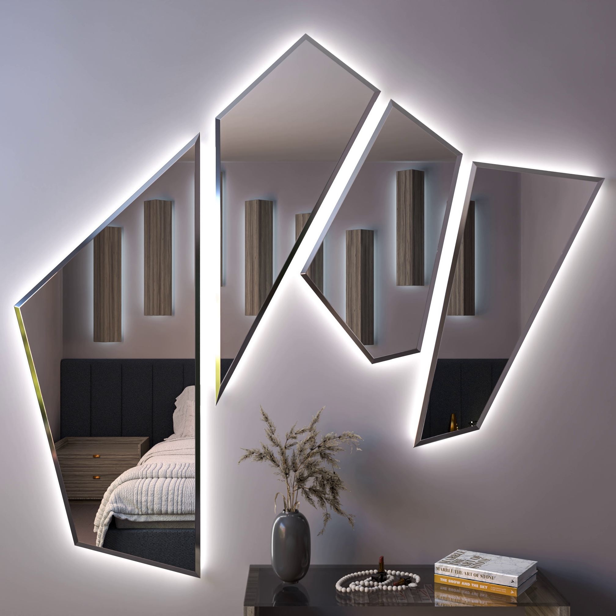 EMPORIO EXTRA — эффектная зеркальная композиция, состоит из четырёх многоугольных зеркал, оборудованных встроенной в корпус из светорассеивающего пластика интерьерной подсветкой, которая выделяет силуэты зеркальных фрагментов и акцентирует внимание на отделке стены. С помощью такого зеркала можно преобразить любой интерьер, сделав его светлее и уютнее Форма - композиция, фигурная Тип подсветки - интерьерная Толщина зеркального полотна - от 4 мм Тип рамы - пластик, дерево (МДФ) Толщина рамы - от 26 мм Тип крепления - навесное Цена указана за композицию в размере - 1800x1656 мм, рама светопропускной ПВХ пластик, выключатель - без выключателя Мы изготовим необходимую Вам зеркальную композицию по индивидуальному размеру и макету, с любым функционалом Для получения консультации Вы можете: - написать на электронную почту: manager@meerhome.ru - позвонить нам: +7 (915) 335-24-04