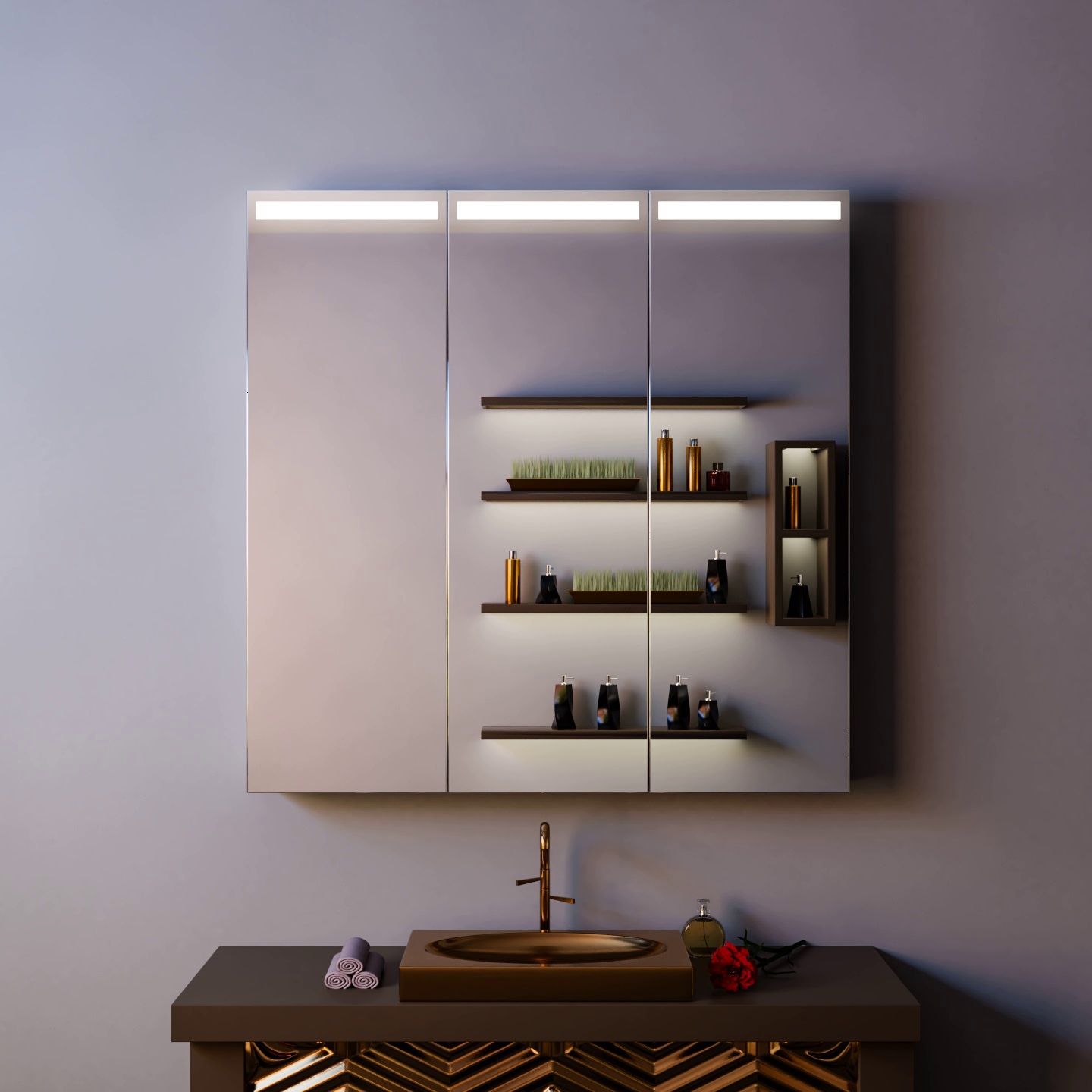 HUGO - зеркальный трехдверный шкаф. В данном случае у шкафа сверху одна светящаяся полоска.За двумя правыми дверцами скрыто главное большое отделение с полочками, а за левой находится меньшее. Наполнение шкафчика может быть кастомизировано согласно Вашим пожеланиям. По умолчанию шкаф комплектуется полками из матового стекла, толщиной 6 мм Форма - прямоугольная Тип подсветки - интерьерная и фронтальная Толщина зеркального полотна - 4 мм Толщина дверки - 24 мм Общая толщина изделия - 160 мм Глубина внутренняя - 125 мм Зеркальный отступ - 10 мм Ширина подсвеченной области - 15 мм Количество дверок - 3 шт Количество отсеков - от 2 шт Количество рядов полок - от 3 шт Тип рамы - дерево (МДФ) Материал полки - стекло или МДФ Тип крепления - навесное Цена указана за шкаф в размере - 600x600 мм, корпус МДФ белый цвет (RAL 9003), фронтальная подсветка, выключатель - стандартный (кнопка на раме) Мы изготовим необходимый Вам зеркальный шкаф по индивидуальному размеру и макету, с любым функционалом Для получения консультации Вы можете: - написать на электронную почту: manager@meerhome.ru - позвонить нам: +7 (915) 335-24-04